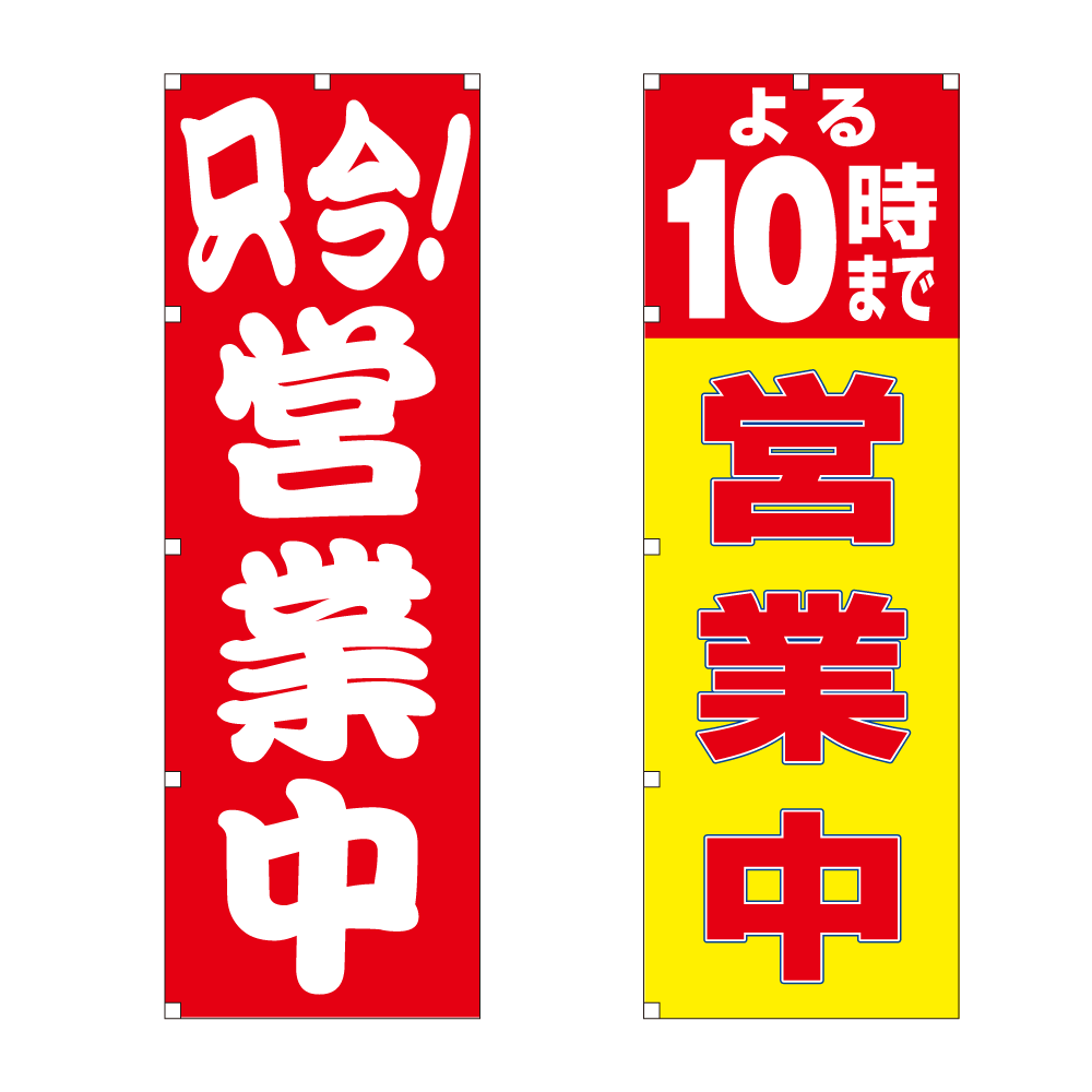 営業中ののぼりは、シンプルな言葉でもデザイン次第で印象や効果が大きく変わります。