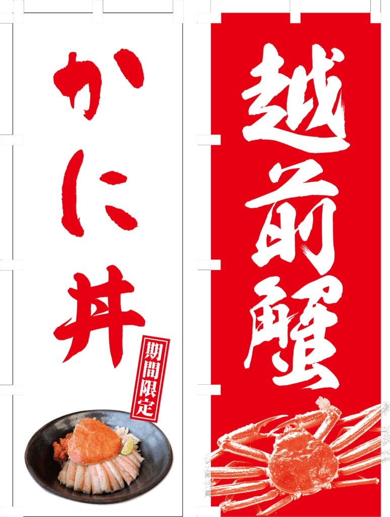 越前がにフェアや冬の味覚キャンペーン、蟹まつりの告知など、季節に合わせたオリジナルデザイン制作も可能です。