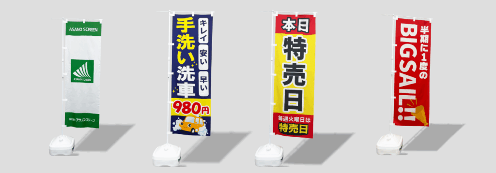 遠くからでも目立つ縦型デザインと、風になびく動きで通行人の目を惹きつけ、ここにお店がある」「いまキャンペーン中」というメッセージをしっかり伝えることができます。